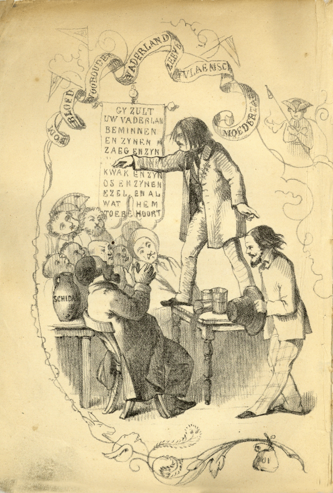Een cafétafereel. Hendrik Conscience staat op een tafel en spreekt de aanwezigen toe. Hij heeft net een glas omgeschopt. De man met de hoed naast hem is Lodewijk Vleeschouwer, de man die zit te applaudisseren is zijn vriend Jan de Laet. Op de banderol bovenaan staan de woorden ‘bloed’, ‘voorouders’, ‘vaderland’, ‘zeever’, ‘vlaemsch’ en ‘moedertaal’. Het figuurtje bovenaan rechts stelt een jezuïet voor, en verwijst naar Consciences roman In ’t Wonderjaer, die de auteur op verzoek van de geestelijke overheid aangepast had voor de gevangenisbibliotheken. Ook hangt er nog een vaandel, met de tekst: ‘Gij zult uw vaderland beminnen en zijnen zaag en zijnen kwak en zijn os en zijnen ezel en al wat hem toebehoort.’