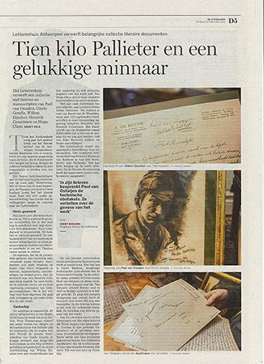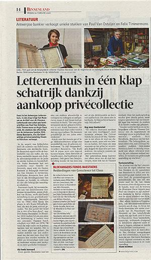 - Handschriften van iconische werken van Felix Timmermans, Pallieter, Adagio, Het Kindeken Jezus in Vlaanderen. Op die manier wordt een belangrijke lacune in de handschriftencollectie van het Letterenhuis opgevuld.