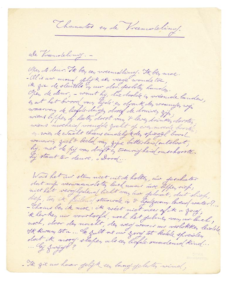 Eerste pagina van het gedicht 'Thanatos en de vreemdeling', ca. 1900