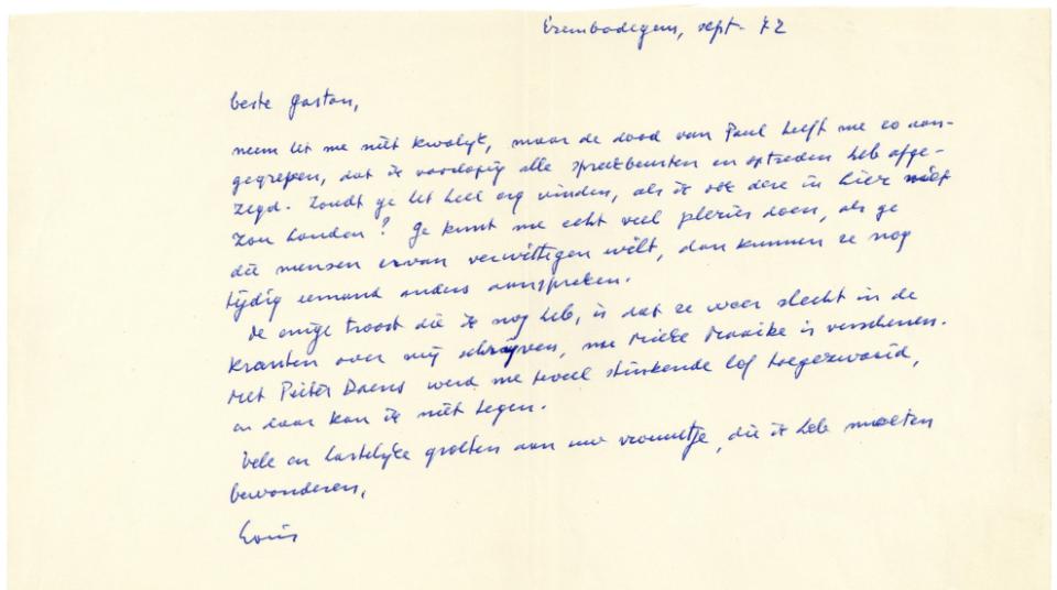 neem het me niet kwalijk, maar de dood van Paul heeft me zo aangegrepen, dat ik voorlopig alle spreekbeurten en optredens heb afgezegd. Zoudt ge het heel erg vinden, als ik ook deze in Lier niet zou houden? Ge kunt me echt veel plezier doen, als ge die mensen ervan verwittigen wilt, dan kunnen ze nog tijdig iemand anders aanspreken.