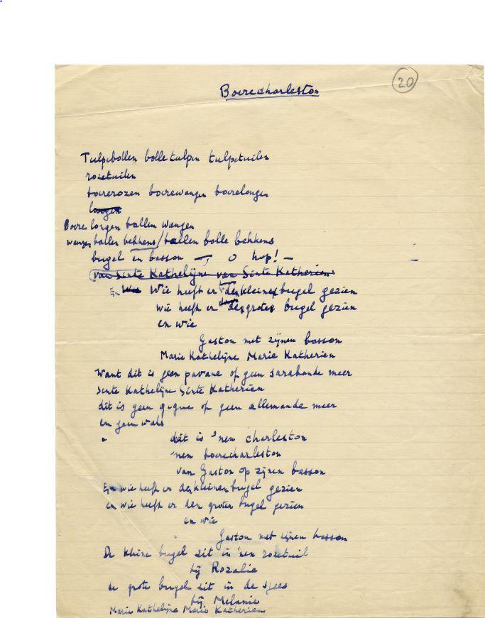 Gedicht 'Boerecharleston' van Paul van Ostaijen. Dit gedicht verscheen in het eerste volume van het tijdschrift Avontuur, in februari 1928. Van Ostaijen schreef aan het einde van zijn leven voornamelijk klankpoëzie, zoals ook 'Marc groet 's morgens de dingen'.