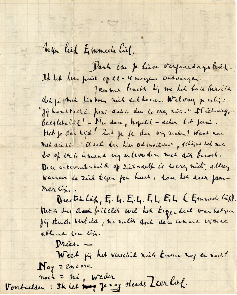 Fragmenten uit een brief van Van Ostaijen aan Emma Clément, februari 1925. Van Ostaijen schreef die vanuit het sanatorium in Miavoye-Anthée. De brief bevat een vroege versie van 'Marc groet 's morgens de dingen'. Zijn stijl was al sterker geëvolueerd naar pure klankpoëzie. Emma Clément was sinds 1923 getrouwd met de Duitse fysicus Peter Pringsheim, maar voor Van Ostaijen bleef ze de liefde van zijn leven.